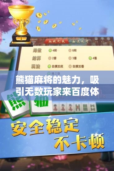 随着互联网的普及和科技的飞速发展,人们对于休闲娱乐的需求也日益增长,在这个背景下,麻将作为一种深受人们喜爱的传统游戏,也在不断地发展和创新,而熊猫麻将则是其中的一种变体,它结合了熊猫这一国宝的形象和麻将的玩法,吸引了众多玩家的关注,接下来就让我们一起通过百度搜索,了解一下熊猫麻将的相关信息吧。