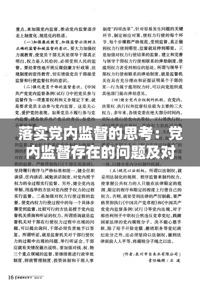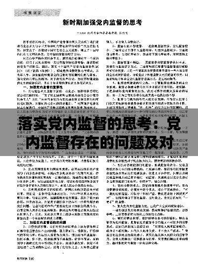 党内监督是党的建设的重要组成部分,是确保党的纯洁性和先进性的关键环节。在新的历史条件下,落实党内监督显得尤为重要。本文将从党内监督的必要性、存在的问题以及改进措施等方面进行思考,以期推动党内监督工作的深入开展。