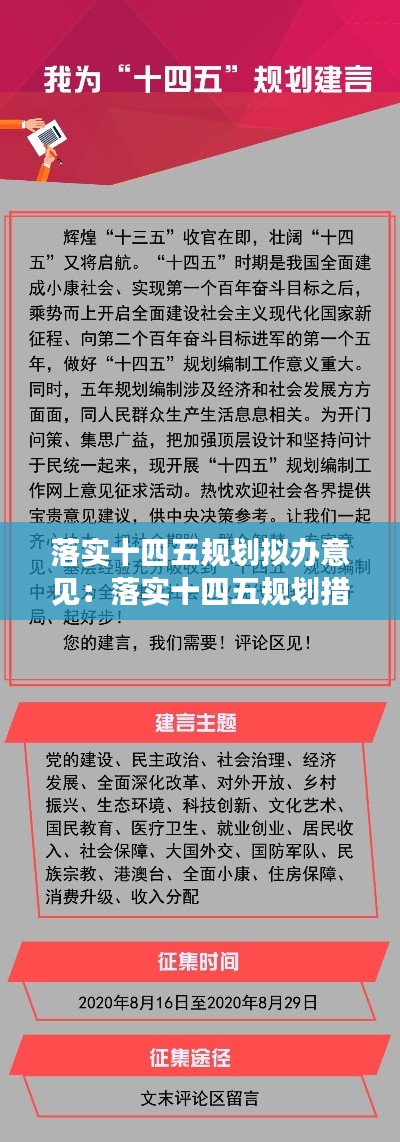 “十四五”规划是我国未来五年的发展蓝图,是国家战略布局的重要组成部分。为了确保规划的有效实施,各级政府和社会各界纷纷提出了一系列拟办意见,旨在推动经济社会发展,实现全面建设社会主义现代化国家的目标。