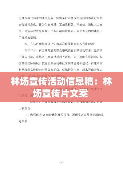 随着我国森林资源的日益丰富和生态环境的持续改善,林场作为维护生态平衡、保障国家生态安全的重要基地,其重要性日益凸显。为了提高公众对林场保护工作的认识,增强社会各界对林场建设的支持,我们特举办此次林场宣传活动。本次活动旨在普及林场知识,倡导绿色生活,共同守护我们的绿色家园。