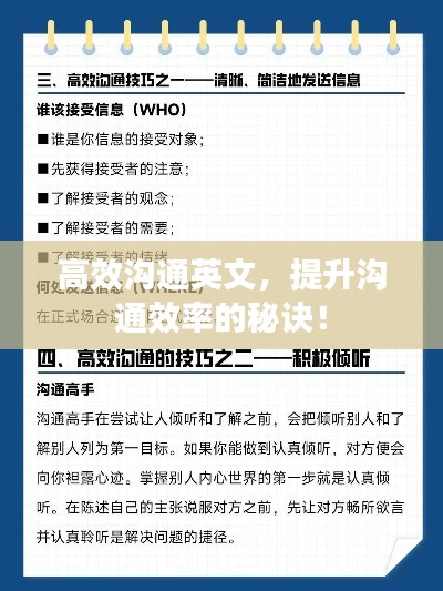 要实现高效沟通英文,提高语言水平是关键,我们需要通过不断学习和实践,扩大词汇量,掌握语法规则,提高听说读写的能力,我们还可以借助在线课程、语言交流社区等资源,提升我们的英语水平。