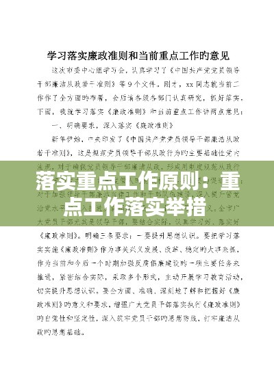在当今快速发展的社会环境中,落实重点工作原则显得尤为重要。无论是国家政策执行,还是企业战略实施,都需要遵循一定的原则,以确保工作的有效性和高效性。本文将探讨落实重点工作原则的重要性,以及如何在实际工作中贯彻这些原则。