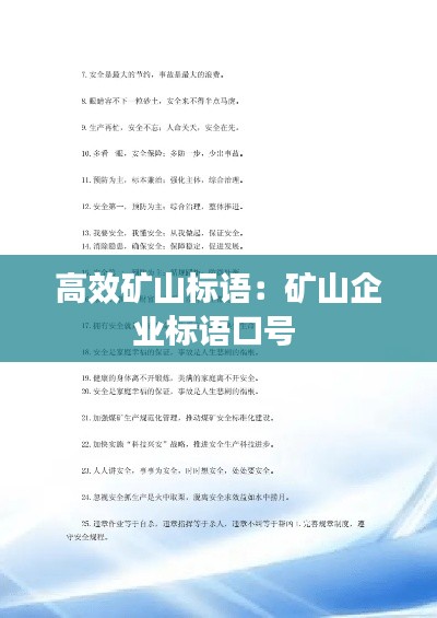 矿山,作为国家经济的重要支柱,承担着为国家提供矿产资源的重要任务。在资源开发过程中,高效、安全、环保是矿山工作的核心要求。为了提高矿山工作效率,激发员工的工作热情,以下是一些高效矿山标语,旨在为矿山工作注入新的活力。