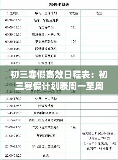 初三寒假高效日程表旨在帮助同学们充分利用假期时间,提高学习效率。通过合理安排作息时间、学习计划和复习重点科目,相信同学们能够在寒假期间取得显著的进步。祝大家度过一个充实、愉快的寒假!