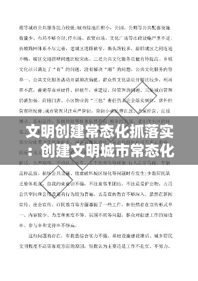 文明是社会进步的标志,是国家软实力的重要组成部分。文明创建常态化抓落实,是推动社会文明进步、提升国家形象的重要举措。然而,在当前社会发展中,文明创建面临着诸多挑战,如何确保文明创建工作常态化、制度化,成为了一个亟待解决的问题。