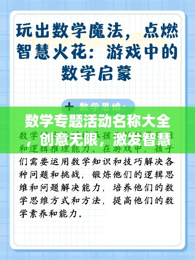 数学,作为自然科学的基础学科,对于培养学生的逻辑思维、推理能力及创新精神具有重要意义,为了丰富数学学习的形式与内容,各类数学专题活动应运而生,本文将为您呈现一系列富有创意的数学专题活动名称,以期激发学习者的兴趣,促进数学教育的普及与发展。