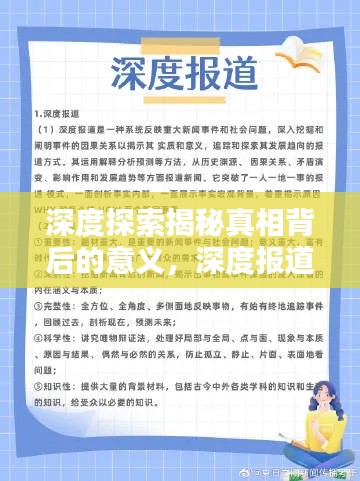 在这个信息爆炸的时代,我们面临着海量的新闻和资讯,真正具有深度的报道却显得稀缺而珍贵,深度报道不仅仅是传递事实,更是揭示事件背后的真相与意义,挖掘事物的内在本质,本文将探讨深度报道的重要性、特点以及如何创作出具有深度的报道。