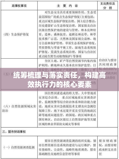 统筹梳理与落实责任是构建高效执行力的关键要素,只有全面、系统地思考和工作,明确责任和任务,加强团队沟通和协作,我们才能构建高效的工作体系,实现我们的目标,希望我们每个人都能深入理解和实践这两个要素,不断提升我们的工作效率和执行力。