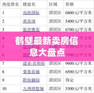 随着城市的发展与繁荣,鹤壁作为河南省的一个重要城市,房地产市场日益活跃,本文将为您带来鹤壁的最新卖房信息,包括不同区域的房源、价格、特点等,以帮助购房者更好地了解市场,做出明智的决策。