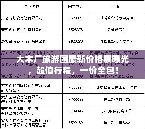 随着人们对旅游的需求日益增长,越来越多的人开始关注旅游团的价格,大木厂作为一个知名的旅游胜地,其旅游团价格备受关注,本文将为大家带来大木厂旅游团价格表最新的相关信息,帮助大家更好地了解大木厂的旅游团价格,为出行做好充分准备。