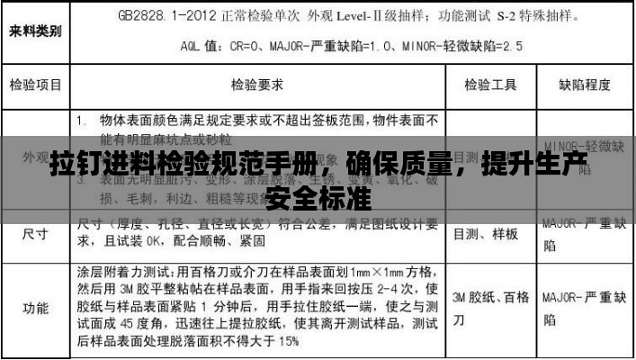 为确保拉钉产品的质量及其在生产过程中的适用性,制定进料检验规范书至关重要,本规范旨在明确拉钉进料的检验标准、程序和方法,以确保进料的质量符合公司标准和客户要求。