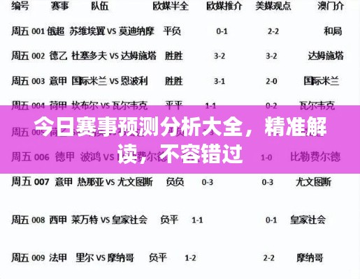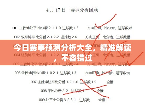 随着体育竞技的日益激烈和科技的飞速发展,人们对于体育赛事的关注程度越来越高,每日都有众多赛事在全球范围内展开,而今日所有赛事预测分析成为了广大体育爱好者关注的焦点,本文将为大家带来最新的赛事预测分析,一同探讨各赛事的走向。