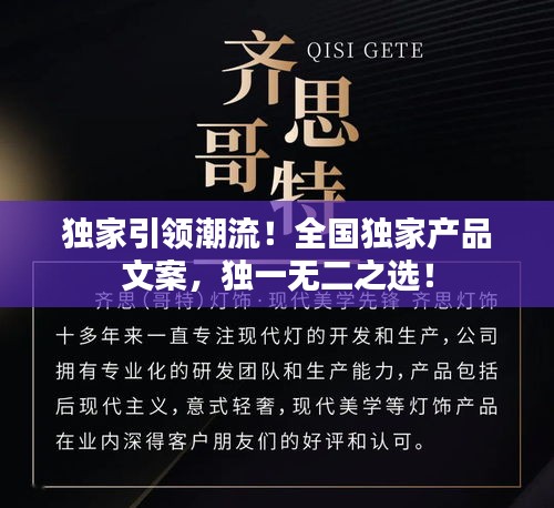这款全国独家产品,是一款独具特色、引领潮流、品质卓越的产品,我们为消费者提供丰富的产品文案、全方位的服务,让消费者尽享专属体验,选择这款产品,就是选择一种独特的生活方式,一种无与伦比的体验。