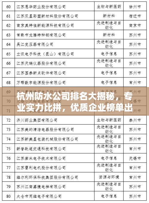 杭州,这座美丽的城市,不仅是经济繁荣的中心,也是众多建筑企业的聚集地,防水工程作为建筑行业中不可或缺的一环,其重要性日益凸显,本文将为您详细介绍杭州防水公司的排名,以帮助您更好地了解这些企业的实力与优势。