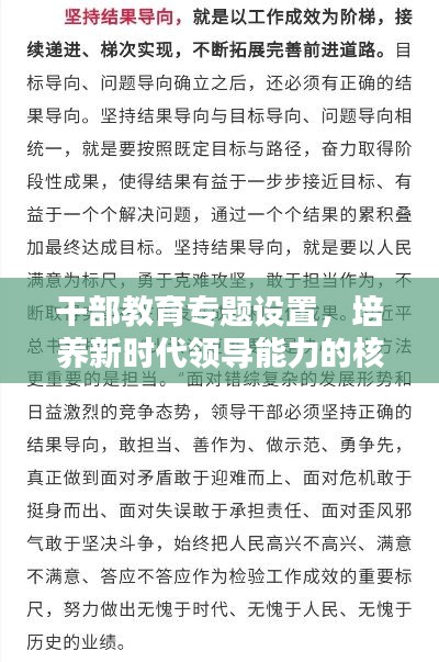 在新时代背景下,干部教育的重要性愈发凸显,作为提升领导干部素质、能力和水平的重要途径,干部教育专题设置显得尤为重要,本文旨在探讨干部教育专题设置的意义、原则及其实践路径,以期为新时代干部教育的深入开展提供参考。
