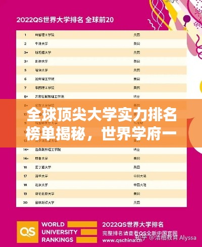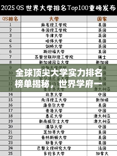 世界大学实力排名,是根据大学的学术研究成果、教学质量、学生满意度、国际化程度等多个因素综合评估得出的结果,这些排名通常由专业的教育评估机构发布,如QS世界大学排名、US News大学排名等,这些排名对于了解全球高等教育格局,以及选择留学目的地和院校都具有重要的参考价值。