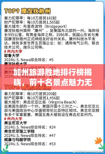 艾尔卡特拉斯海岸线是加州最著名的海岸线之一,这里有悬崖峭壁、美丽的海滩和丰富的野生动物,红杉树国家公园则拥有世界上最高的红杉树,这里的自然景观令人叹为观止,红木州立公园则是一个融合了自然美景和城市便利的绝佳去处,在这里可以欣赏到美丽的海滩和红杉树的美景,还可以享受城市的便利设施,这里还有许多户外活动可供选择,如徒步旅行、冲浪等,在这里度过一个充满活力和乐趣的假期吧!第二名:优胜美地国家公园(Yosemite National Park)优胜美地国家公园是加州最著名的自然景点之一,以其壮丽的山脉景色、瀑布和森林而闻名于世,这里是户外活动的绝佳场所,游客可以在这里徒步旅行、露营和钓鱼等,公园内最著名的景点包括酋长岩和半圆顶等壮观的山峰景观以及瀑布美景等等,在这里度过一个亲近大自然的日子吧!第一名:环球影城好莱坞主题公园环球影城好莱坞主题公园是加州最著名的主题公园之一,以其丰富的电影主题活动和刺激的游乐设施而闻名于世,游客可以在这里参观电影制片厂和各种电影主题的游乐项目等体验电影文化的魅力同时享受乐趣无穷的游乐体验此外还可以观看各种精彩的表演节目和演出等等在这里度过一个充满刺激和乐趣的假期吧!除了以上十个景点外加州还有许多其他值得一游的景点如圣塔莫尼卡海滩、洛杉矶艺术博物馆等等无论你是想亲近大自然还是感受城市文化都可以在这里找到适合自己的旅游项目总之加州是一个充满活力和魅力的地方无论你是与家人出游还是与朋友聚会这里都是一个绝佳的旅游目的地!