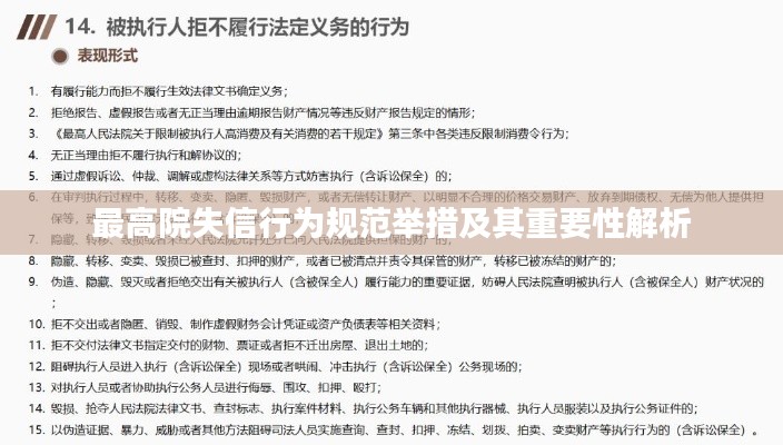 为了更好地理解最高院如何规范失信行为,我们可以参考一些实际案例,在某企业因债务问题被列入失信被执行人名单后,最高院通过公开曝光、限制高消费等措施,促使该企业积极履行法律义务,最终实现了债务清偿,恢复了企业的信誉,这一案例充分展示了最高院规范失信行为的重要性。