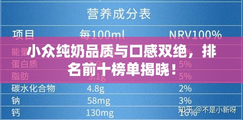 随着人们对健康饮食的追求,越来越多的人开始关注乳制品的品质,纯奶作为一种营养丰富的饮品,在市场上受到了广泛的关注,本文将为您介绍小众纯奶排名前十名,这些品牌不仅在品质上有所保证,更是口感与特色的完美结合。