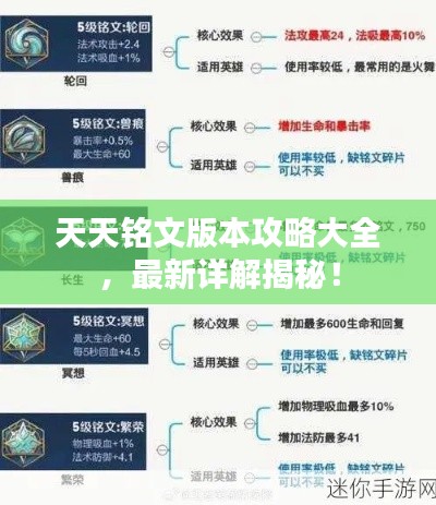 随着游戏版本的更新迭代,天天铭文也在不断地进行优化和更新,本文将为大家带来天天铭文版本攻略最新详解,帮助大家更好地适应新版本,提升游戏体验。