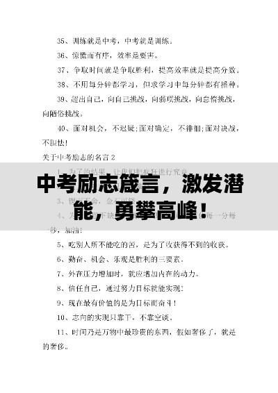 中考,是每个初中生迈向高中大门的重要一步,在这个关键时刻,我们需要励志,需要鼓舞,需要前行,以下是一些中考励志语录和鼓舞人心的文字,希望能为所有即将面对中考的同学们加油打气,助力你们勇往直前。