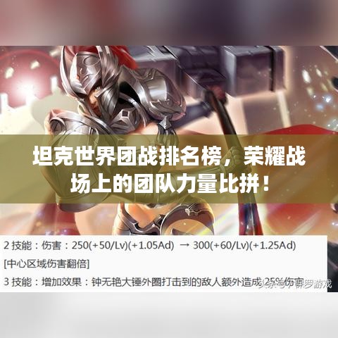 坦克世界团战排名是团队荣誉与个人实力的体现,在这个充满挑战与荣耀的战场上,玩家需要不断提升自己的实力,学会与队友配合,共同争夺战场胜利,通过本文的解析,希望读者能更深入地了解坦克世界团战排名背后的故事,更好地享受这个充满激情与荣耀的战场。