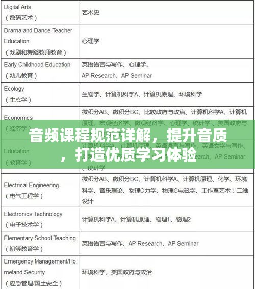 随着在线教育的快速发展,音频课程作为一种重要的远程教学方式逐渐受到广泛关注,为确保音频课程的质量与效果,制定一套完善的音频课程规范显得尤为重要,本文旨在明确音频课程的制作标准、内容要求、技术规范和评估机制,以提高音频课程的教学质量和效果。