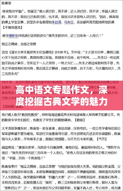 语文,作为中华文化的载体,承载了五千年的文明史,高中语文专题作文,是我们深入探索这一文明的重要途径,在浩瀚的文学海洋中,古典文学是一颗璀璨的明珠,它以其独特的魅力,吸引着我们去探寻、去品味,本文将围绕高中语文专题作文,探索古典文学的魅力,领略语文学习的乐趣。