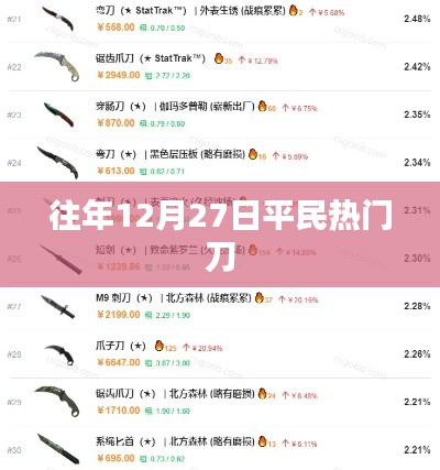 在往年12月27日这一天,刀具市场呈现出一种独特的繁荣景象,随着节日氛围的浓厚,人们对于刀具的需求也逐渐增加,在这个时期,一些平民化的热门刀具成为了市场上的佼佼者,它们不仅价格亲民,而且实用性强,深受大众喜爱。