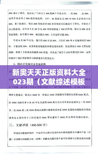 “新奥天天正版资料大全023期(文献综述模板)”是由专业文献工作者精心打造的绩效文献资源集合。作为一份综合了多份宝贵资料和研究成果的综述模板,旨在为研究者提供一个清晰的文献资源架构和研究导向。本综述模板的核心内容涵盖以下几个部分: