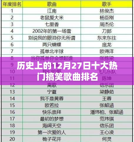 每年的12月27日,都是音乐界值得纪念的日子,这一天,众多经典搞笑歌曲横空出世,成为一代代人心中的美好回忆,本文将为您盘点历史上的12月27日十大热门搞笑歌曲排名,带您重温那些令人捧腹的旋律。