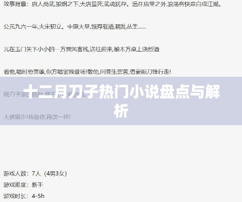 随着年末的临近,众多小说作品如潮水般涌现,其中不乏一些引人入胜的佳作,本文将为大家盘点十二月刀子的热门小说,带你领略这些小说的魅力所在。