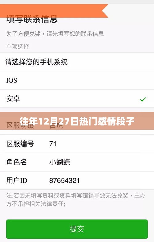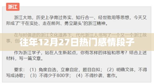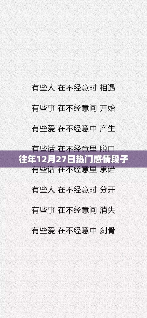 每年的12月27日,总有一些温馨、感人的感情段子在社交网络上走红,它们或许讲述了一段动人的爱情故事,或许传递了一种关于情感的深刻思考,以下是往年这一天备受关注的感情段子,让我们一起感受其中的温情与美好。