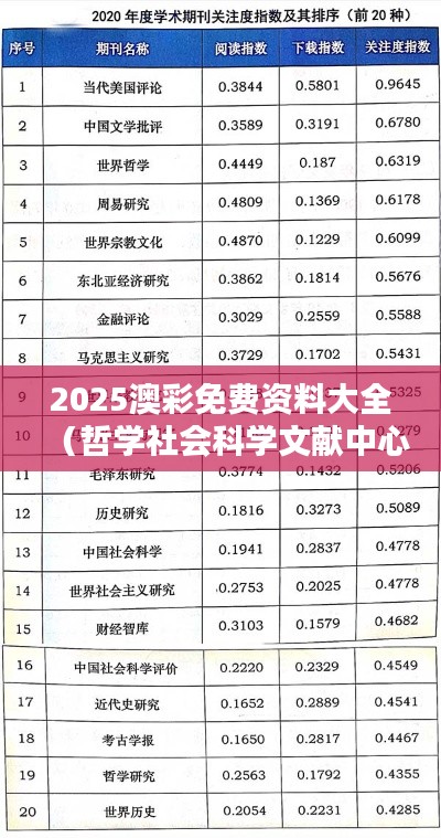 结语通过对《2025澳彩免费资料大全(哲学社会科学文献中心)》的综合性分析,我们不仅能了解到澳彩数字化背景下的澳大利亚哲学社会科学文献资料的丰富性和多样性,还能深刻认识到在数字化时代对于传统文化符号的重新诠释和应用的重要性。未来,希望读者能够通过这些资料进一步深化对澳大利亚哲学社会科学领域的理解和认识,促进跨学科的研究和合作。