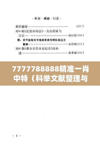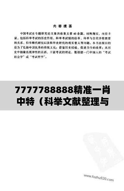 "7777788888精准一肖中特(科举文献整理与研究)"是一个专注于科举文献资料整理与研究的项目。在这篇文章中,我们将详细介绍该项目中详细收集和整理的文献清单。在此过程中,我们将尽量避免涉及任何赌博或彩票相关的信息,以确保内容的准确性和严谨性。