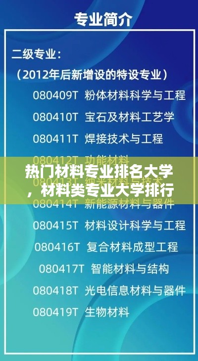 随着科技的飞速发展,材料科学在各个领域都扮演着至关重要的角色。从航空航天到生物医学,从新能源到电子信息,材料专业的研究和应用无处不在。因此,选择一所优秀的材料专业大学对于学生的未来发展至关重要。本文将为您介绍几所热门材料专业排名靠前的大学,帮助您了解这些顶尖学府的教育资源和学术氛围。