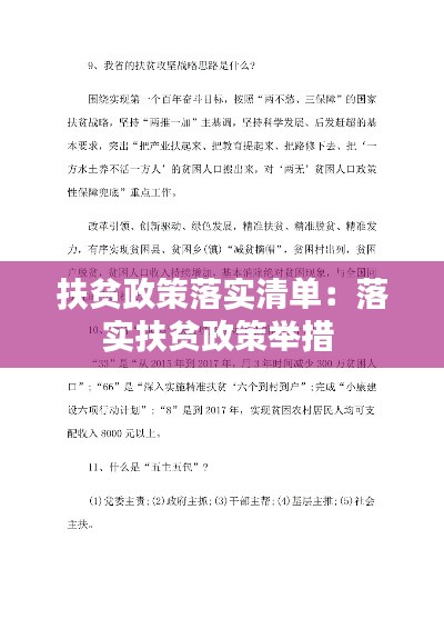 扶贫政策的落实清单涉及多个方面,旨在确保贫困地区和贫困人口得到全面、有效的帮扶。各级政府和社会各界应共同努力,确保扶贫政策落到实处,助力贫困地区实现全面小康。