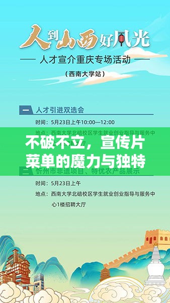 在当今社会,宣传片已成为一种重要的媒介形式,用以展示品牌理念、推广产品与服务。“不破不立”作为一种富有哲理的口号,被广泛应用于各类宣传片中,旨在传达一种破旧立新、勇于突破的精神,本文将围绕“不破不立宣传片菜单”这一主题,为您揭示宣传片的独特魅力。