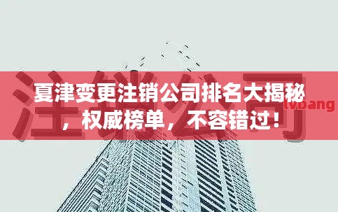 随着市场经济的发展,企业变更与注销是常态,夏津县作为一个经济活跃的地区,其变更注销公司的数量和活跃度也相对较高,本文将介绍夏津变更注销公司的排名,旨在为企业家们提供参考,了解当地企业在变更注销方面的动态。