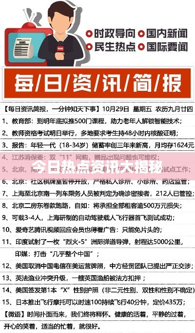 今日焦点资讯涵盖了全球疫情动态、国内经济形势、科技创新、国际政治经济局势、社会热点问题、文化娱乐产业、体育赛事以及自然灾害与环境保护等多个领域,本文旨在为读者提供全面的资讯信息,帮助大家了解世界最新动态,把握时代脉搏。